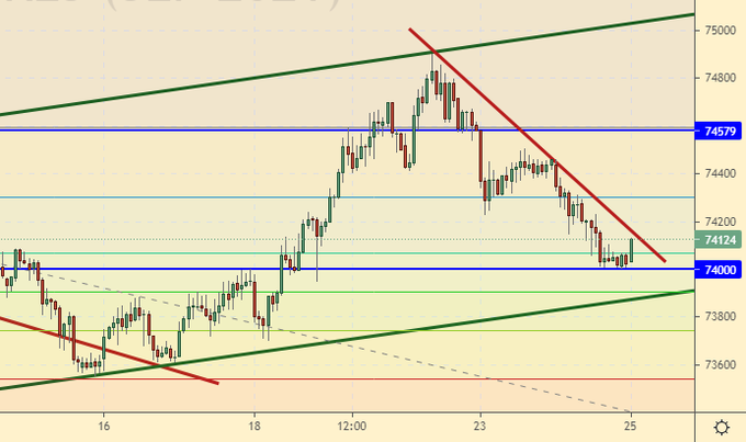 Покупка: нет. Кто в позиции от 74200, держите стоп на 73900. Цель: 75000.
