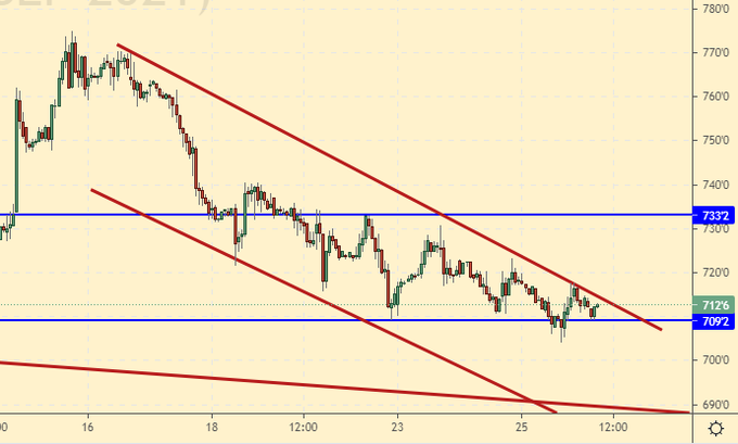 Рынок не спешит падать ниже 700.0. Это упрямство создает предпосылки для роста в случае подъема выше 720.0. Мы бы не рекомендовали входить в рынок с покупками пока мы ниже 740.0. Шансы на падение еще остаются, так как на рынок выходят всё новые партии зерна.