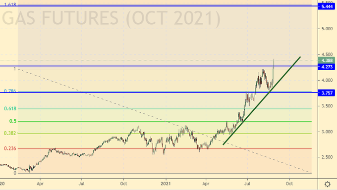 Сценарий роста: рассматриваем октябрьский фьючерс, дата экспирации 28 сентября. В Европе началась какая-то юридическая игра с «Северным потоком – 2», если не сказать «шантаж». У «Газпрома» хотят купить трубу, а по факту отобрать. «Газпром» перестал продавать газ на 2022-й год. На фоне сего агрессивного спора рост цен будет продолжен.