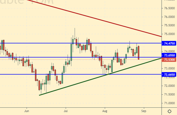 Сценарий падения: будем держать открытый на прошлой неделе шорт от 73.90. Более того, добавим в случае падения цен ниже 73.10. Если доллару станет плохо в мировом масштабе, то рубль может на дорогой нефти и высокой ставке ЦБ окрепнуть до 67.75.