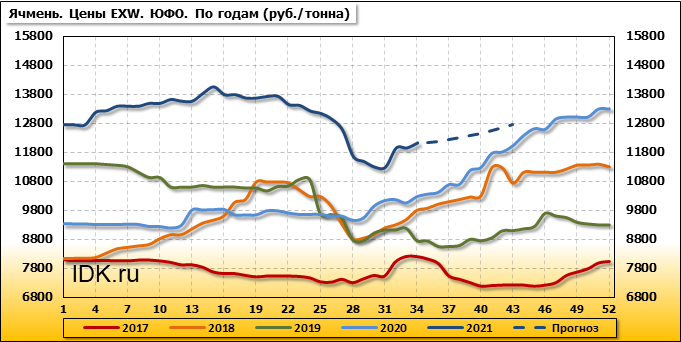 В Южном федеральном округе внутренние цены на ячмень выросли на 174 руб./т. и на данный момент составляют 12133 рубля за тонну.