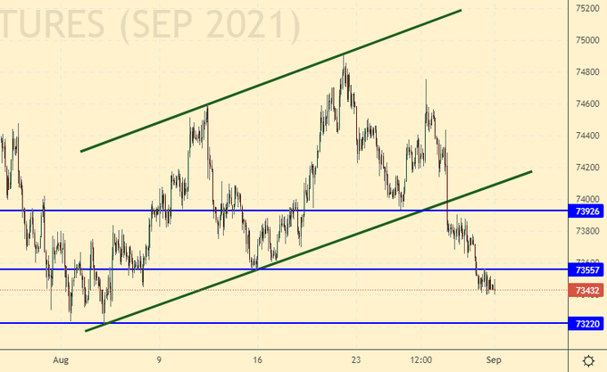 Продажа: при подъеме к 73800. Стоп: 74400. Цель: 68000?! Кто в позиции от 73800, перенесите стоп на 73600. Цель: 68000.