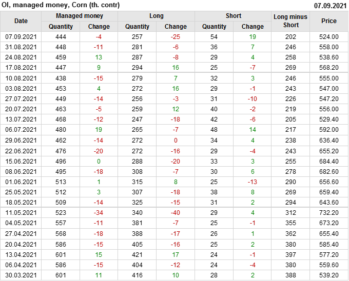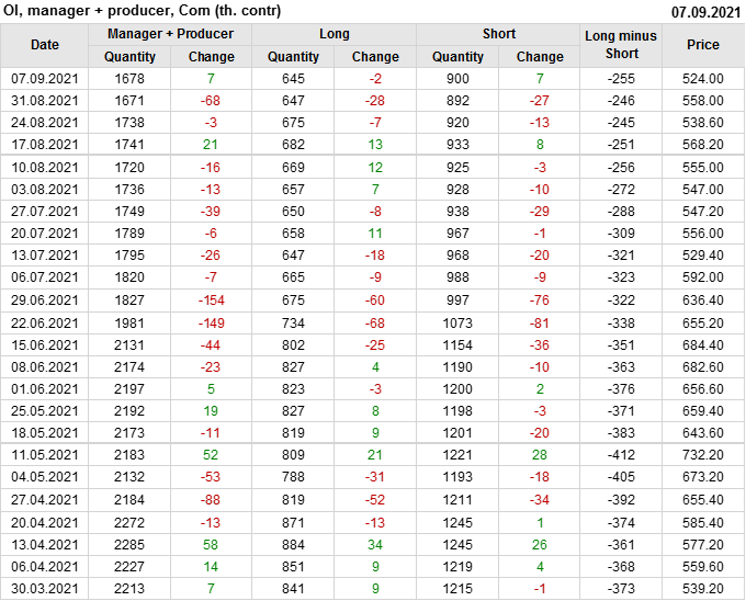 За прошлую неделю, 01.09.21 — 07.09.21, разница между длинными и короткими позициями управляющих сократилась на 43.5 тыс. контрактов. В тоже время, цена упала на 34 цента.