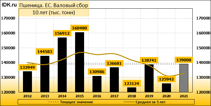 Производство пшеницы в Европейском союзе оценивается в 139,0 млн метрических тонн, что на 0,40 млн тонн больше, чем ожидалось в прошлом месяце, и на 13,06 млн тонн больше, чем было произведено в предыдущем году. Уборочная площадь оценивается в 23,93 млн га, без изменений по сравнению с прошлым месяцем, но на 0,85 млн га больше, чем в предыдущем году. Урожайность оценивается в 5,81 тонны с гектара, что немного больше, чем ожидалось в прошлом месяце. Прогноз экспорта пшеницы из ЕС в 2021/22 году не изменился и составляет 35 млн тонн.