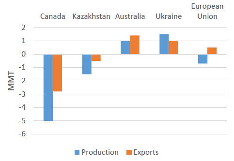 | Канада | Ячмень | Экспорт | 2 700 | 2 000 | -700 | Снижение доступных запасов |