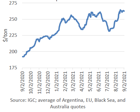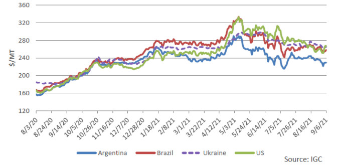 После публикации августовского отчета WASDE основные экспортные цены снизились. Цены в Бразилии упали на 9 долларов за тонну до 258 долларов, а в Аргентине — на 10 долларов за тонну до 230 долларов из-за давления со стороны урожая. Украинские цены снизились на 3 доллара за тонну до 265 долларов на фоне ожиданий рекордного урожая. Цены в США снизились на 9 долларов за тонну до 267 долларов из-за слабого внешнего спроса. Береговая охрана США открыла нижнюю часть реки Миссисипи для всего движения судов после урагана Ида, хотя работа элеваторов по-прежнему серьезно затруднена.