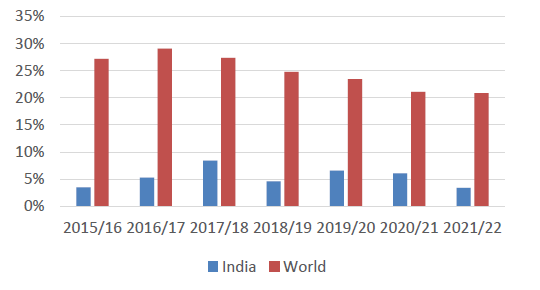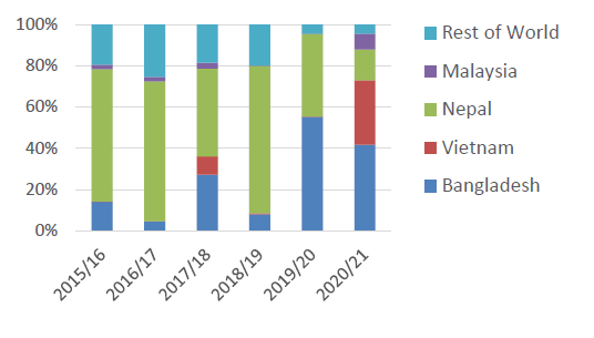 Традиционно цены на индийскую кукурузу не были конкурентоспособными по сравнению с ценами основных мировых экспортеров. В 2020/21 году высокие мировые цены на кукурузу, поддерживаемые резким падением производства в Бразилии из-за засухи и сокращением запасов в Соединенных Штатах, сделали индийскую кукурузу жизнеспособным вариантом на мировом рынке. Средняя экспортная цена в Индии на условиях FOB в мае 2021 года составляла 243 доллара за тонну, что меньше, чем в США (269 долларов), Бразилии (304 доллара за тонну) и Украине (292 доллара). Это, в сочетании с замедлением темпов роста внутреннего сектора птицеводства из-за COVID-19, стало катализатором взрывного роста экспорта кукурузы из Индии. Прогнозируется, что в 2020/21 году (октябрь-сентябрь) Индия поставит 3,5 миллиона тонн кукурузы, при этом экспорт во Вьетнам и Малайзию составит более 1,1 миллиона тонн в совокупности, что почти соответствует совокупному экспорту кукурузы из Индии в 2019/20 году.