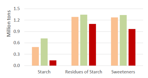 Данные о переработке кукурузы в Китае не являются общедоступными, но данные Китайской таможни показывают, что экспорт основных продуктов на основе кукурузы значительно отстает от прошлых лет. За первые 10 месяцев (октябрь-июль) экспорт кукурузного крахмала был наименьшим по объему с 2015/16 года, а подсластителей на основе кукурузы — наименьшим с 2014/15 года. В последние годы Китай был крупнейшим экспортером кукурузного крахмала. Что касается подсластителей на основе кукурузы в 2019/20 г. Китай обошел Соединенные Штаты и стал крупнейшим экспортером. С другой стороны, импорт маниоки, альтернативы кукурузе в производстве топливного этанола, вырос на 56 процентов до 4,1 миллиона тонн по сравнению с прошлым годом, что является самым большим объемом с 2017/18 года.