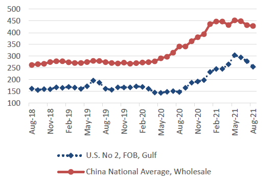 Кормовое и остаточное потребление кукурузы, хотя и немного снижено по сравнению с прошлым месяцем из-за увеличения потребления ячменя и сорго, по прогнозам, будет расти. С восстановлением поголовья свиней после африканской чумы свиней спрос на корма поддерживал цены. Внутренние цены на кукурузу оставались близкими к рекордным уровням, несмотря на значительное высвобождение запасов пшеницы и риса из резервов в начале этого года, о чем сообщали СМИ. Однако высокие цены на внутреннем рынке, должно быть, привели к увеличению затрат на переработку и снижению рентабельности.