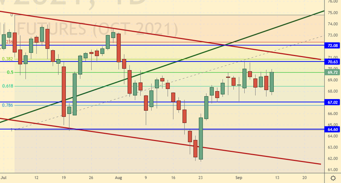 Growth scenario: October futures, expiration date September 21. While we are below 73.00 we will refrain from shopping. Green Friday gives a slight advantage to buyers, but there is no certainty that the bulls will win in this situation.