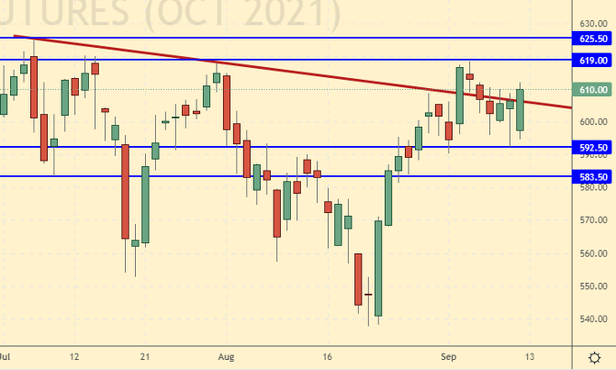 Fall scenario: keep short from 584.0. USDA’s good August forecast for corn was improved by almost a percentage point on Friday. Recommendation: