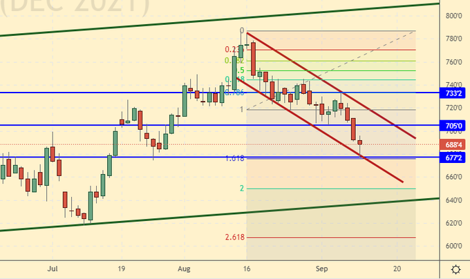 Growth scenario: December futures, expiration date December 14. The market nevertheless deigned to decline. If prices return above 715.0, we will buy. It cannot be ruled out that wheat prices will go to the area of 900.0.
