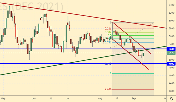 Growth scenario: October futures, expiration date September 28. Gas price in Europe is breaking records. $ 700 per thousand cubic meters, this is three times the price of Gazprom’s long-term contracts. We’ll get to 5.444 for sure. And then the Nord Streams will be launched at full capacity and growth will stop.
