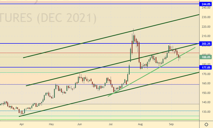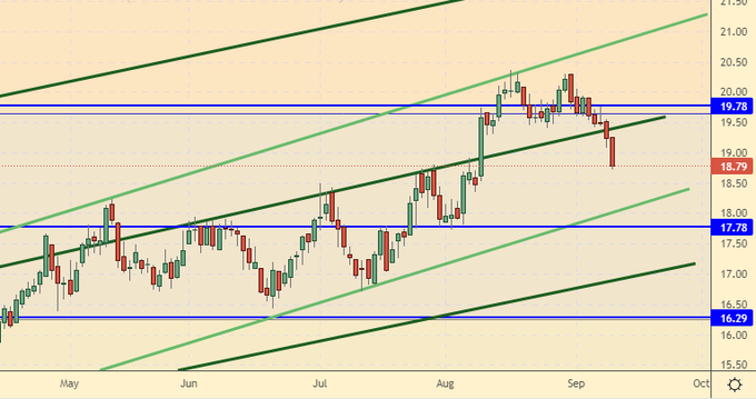 Growth scenario: October futures, the expiration date is September 30. Unfortunately, the bulls were unable to reach 21.66. A fall by 17.00 cannot be ruled out. Out of the market.