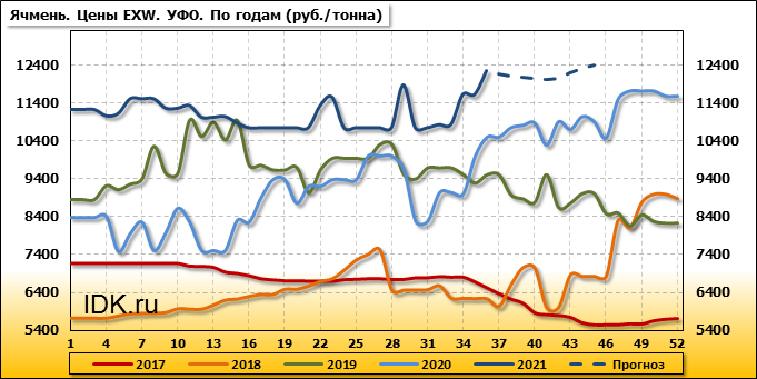 Внутренние цены на ячмень в Уральском федеральном округе выросли на 625 руб./т. и на данный момент составляют 12250 рублей за тонну.