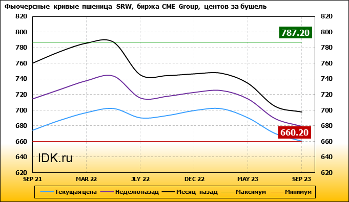 На 13.09.2021 стоимость пшеницы SRW на бирже CME Group по контракту SEP 21 составила 674.4 цента за бушель. За прошедшую неделю стоимость пшеницы SRW упала на 40 центов/бушель. Как мы видим на графике, фьючерсная кривая имеет периоды, когда более дальний фьючерс дешевле ближнего. Состояние бэквардации наблюдаем на следующих контрактах: JLY 22; MAY 23; JLY 23; SEP 23. Таким образом, трейдеры предполагают, что возможно превалирование предложения над спросом в указанные периоды.