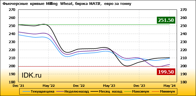 На 13.09.2021 стоимость пшеницы Milling Wheat на бирже MATIF по контракту Dec ’21 составила 239 евро за тонну. За прошедшую неделю стоимость пшеницы Milling Wheat упала на 3.25 евро/тонна. Как мы видим на графике, фьючерсная кривая имеет периоды, когда более дальний фьючерс дешевле ближнего. Состояние бэквардации наблюдаем на следующих контрактах: Mar ’22; May ’22; Sep ’22; Sep ’23; Mar ’24. Таким образом, трейдеры предполагают, что возможно превалирование предложения над спросом в указанные периоды.