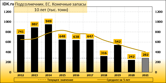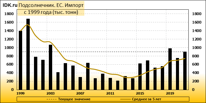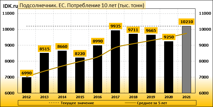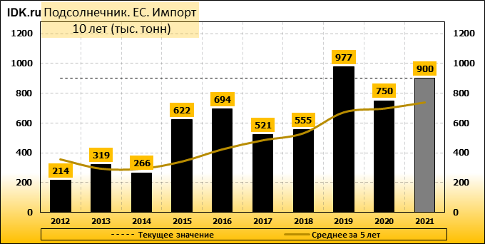 Министерство Сельского Хозяйства США оставило без изменений прогноз производства подсолнечника в ЕС в 2021/22 году на уровне 10 млн. тонн, что на 1,15 млн. тонн или 13 процентов превышает производство в предыдущем году. Как и в прошлом месяце, урожайность подсолнечника в ЕС прогнозируется на уровне 2,27 т/га, а уборочная площадь – 4,41 млн. га. Прогноз по импорту подсолнечника в ЕС в 2021/22 году, как и в прошлом месяце, прогнозируется на уровне 900 тыс., по сравнению с 750 тыс. тонн в предыдущем году.