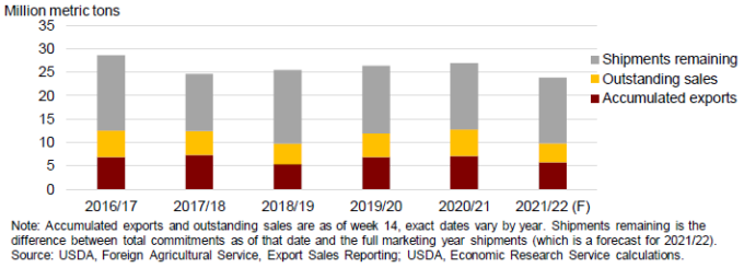 Ожидается, что экспорт США выиграет от снижения конкуренции во второй половине маркетингового года, поскольку запасы конкурентов станут более ограниченными, особенно с учетом низких запасов в Канаде и неопределенности в отношении экспортной пошлины в России. Похожая ситуация сложилась в 2018/19 году, когда общие экспортные обязательства по состоянию на 14-ю неделю составляли лишь 38 процентов от общего объема за маркетинговый год. Поставки в этом году резко выросли во второй половине года, поскольку экспорт из России сократился, а цены на американскую пшеницу на ключевых рынках стали более конкурентоспособными.