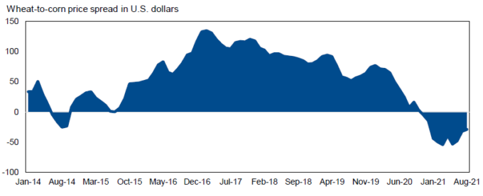 Рисунок 2. Спрэд внутренних цен на пшеницу и кукурузу в Китае в 2021 году остается низким
