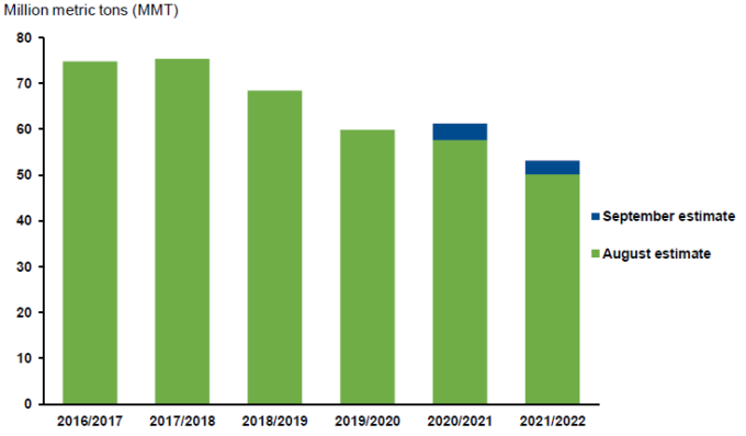 Мировые конечные остатки 2020/21 года пересмотрены в сторону увеличения на 3,7 млн тонн до 292,6 млн тонн. Большая часть этой корректировки связана с Канадой и ЕС. Статистическое управление Канады опубликовало обновленные данные по конечным остаткам на 2020/21 год в размере 5,7 млн метрических тонн, что на 1,9 млн метрических тонн больше августовской оценки Министерства сельского хозяйства США. Что касается ЕС, то его конечные остатки 2020/21 года пересмотрены в сторону увеличения на 1 миллион метрических тонн до 10,1 миллиона за счет более медленных темпов экспорта в конце маркетингового года.