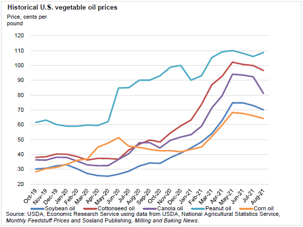 В течение 2020/21 маркетингового года цены на соевое масло продолжали расти; однако это не единственное растительное масло, которое демонстрирует повышение цен в США. Фактически, внутренние цены на хлопковое, рапсовое и арахисовое масло более чем удвоились с августа 2020 года. Цены на хлопковое и рапсовое масло в мае 2021 года достигли максимумов в 102 и 94 цента за фунт соответственно, которые не наблюдались с 1994/95 маркетингового года. Цены на кукурузное масло также достигли пика в 68 центов за фунт в мае, что почти на 26 центов выше цены открытия 2020/21 маркетингового года. Цены на масло снизились за последние пару месяцев, поскольку более высокие цены привели к сокращению использования соевого масла в секторе производства биотоплива и экспорта. Ожидается, что цены на растительные масла, в значительной степени за счет расширения сектора биотоплива, сохранят высокий уровень в следующем маркетинговом году.