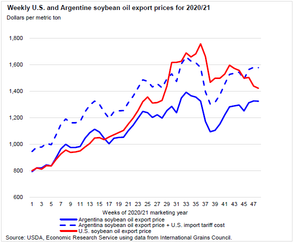 Из-за высоких цен на соевое масло и снижения рентабельности переработки использование соевого масла для производства биотоплива за последние несколько месяцев сократилось по сравнению с предыдущим годом. Кроме того, закрытие заводов в июне, согласно отчету Управления по энергетической информации США (EIA), значительно снизило использование соевого масла при производстве биотоплива с 788 миллионов фунтов в мае 2021 года до 663 миллионов фунтов в июне 2021 года. В результате оценка использования соевого масла для производства биотоплива в 2020/21 году была снижена на 300 миллионов фунтов до 8,8 миллиарда фунтов. Более медленное наращивание производства возобновляемого дизельного топлива приводит к снижению потребления соевого масла на 500 миллионов фунтов до 11 миллиардов фунтов в 2021/22 году.