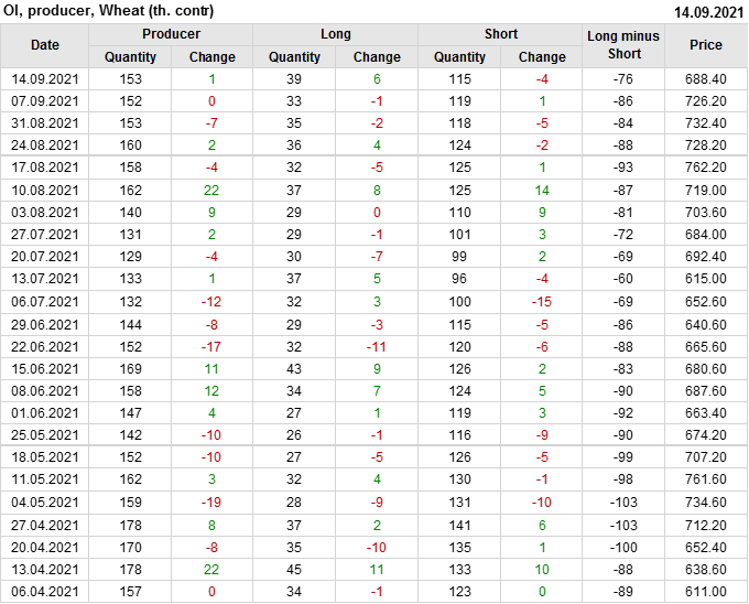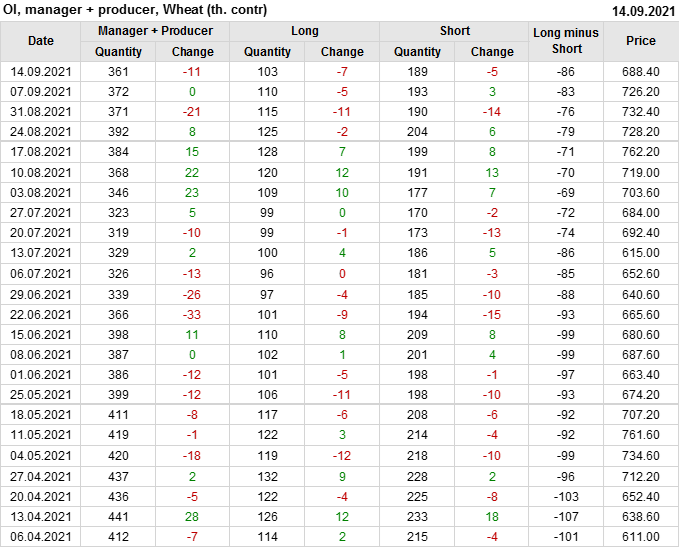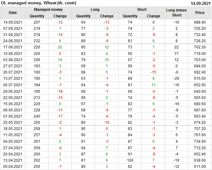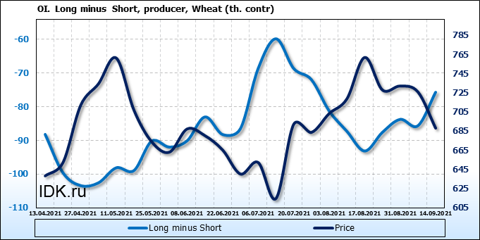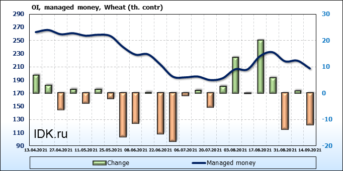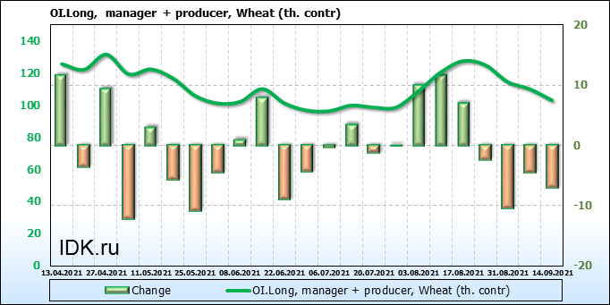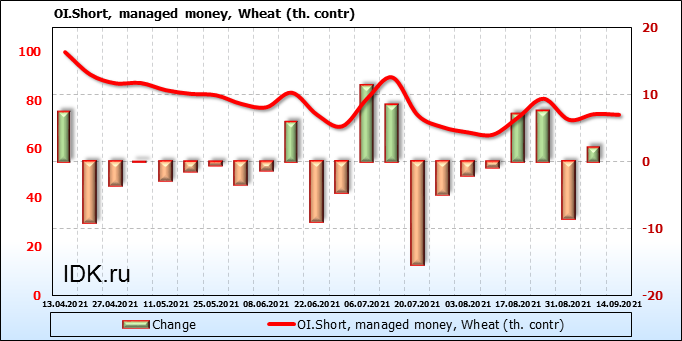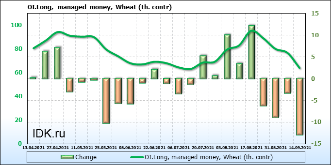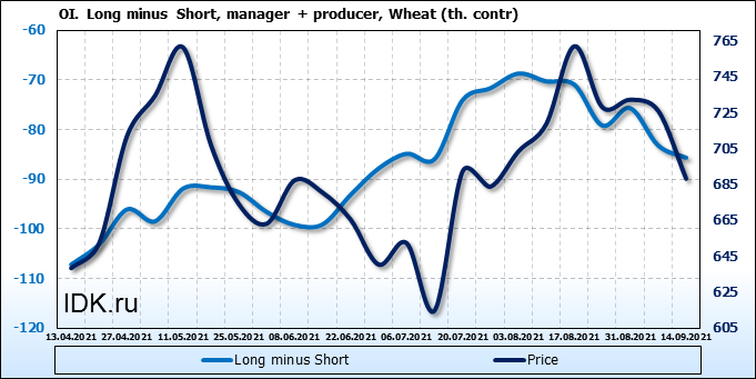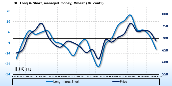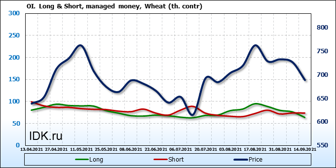 За прошлую неделю, 08.09.21 — 14.09.21, разница между длинными и короткими позициями управляющих увеличилась на 12.4 тыс. контрактов. В тоже время, цена упала на 37.8 цента.