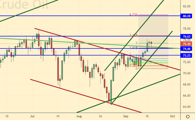 Рынок нефти стабилен. Не исключено, что зимой со стороны Европы и США будет повышенный спрос на любые виды топлива. Страх перед холодами поддержит цены на нефть в среднесрочной перспективе. На данный момент есть шанс дойти до уровня 80.00 долларов за баррель нефти марки Brent. Подняться выше будет крайне непросто.