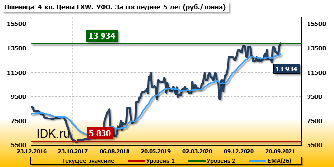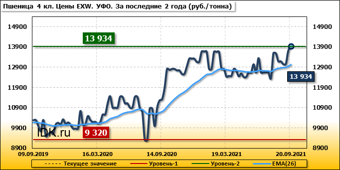Цены на пшеницу 4-го класса поднялись на 220 руб./т. и на данный момент составляют 13934 рубля за тонну.