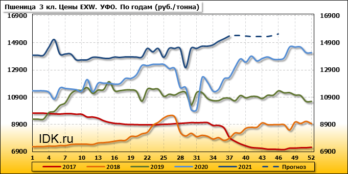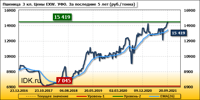 Внутренние цены на пшеницу 3 класса в Уральском федеральном округе выросли на 212 руб./т. и на данный момент составляют 15419 рублей за тонну.