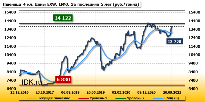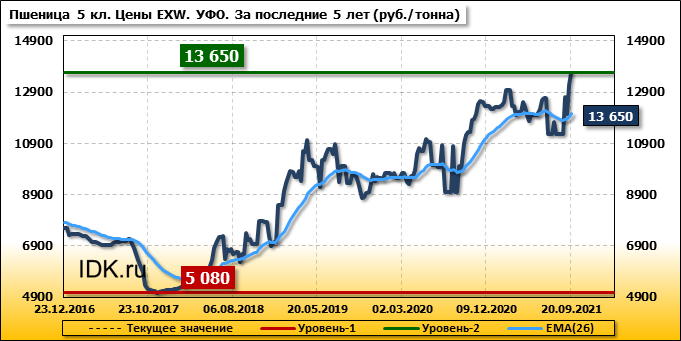 Цены на пшеницу 5-го класса повысились на 482 руб./т. и на данный момент составляют 13650 рублей за тонну.