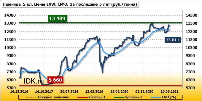 Цены на пшеницу 5-го класса понизились на 111 руб./т. и на данный момент составляют 13011 рублей за тонну.