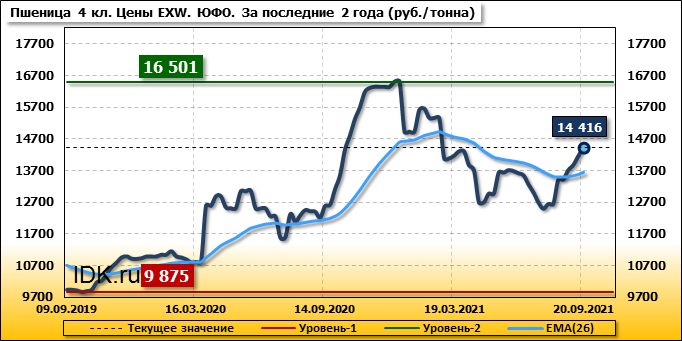 Цены на пшеницу 4-го класса поднялись на 271 руб./т. и на данный момент составляют 14416 рублей за тонну.