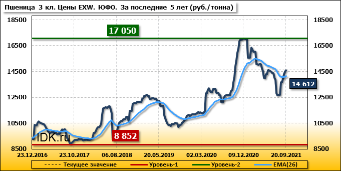 В Южном федеральном округе внутренние цены на пшеницу 3 класса выросли на 125 руб./т. и на данный момент составляют 14612 рублей за тонну.