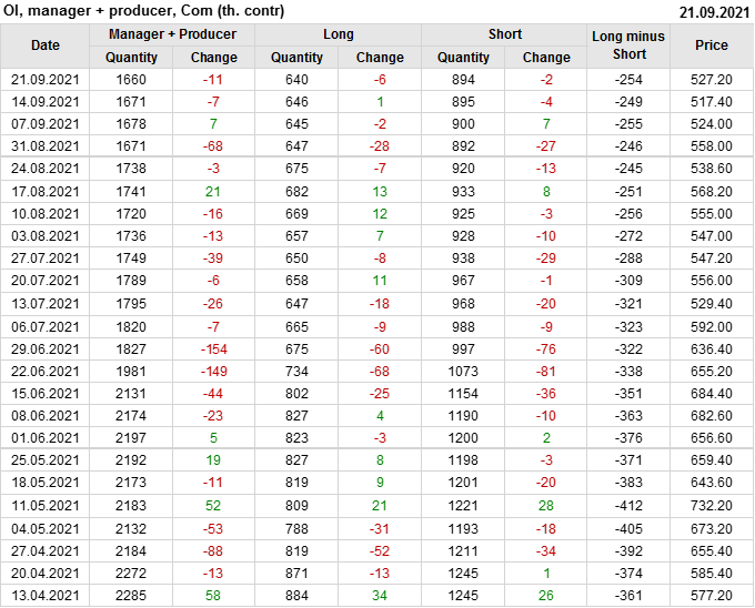 За прошлую неделю, 15.09.21 — 21.09.21, разница между длинными и короткими позициями управляющих увеличилась на 2.2 тыс. контрактов. В тоже время, цена выросла на 9.8 цента.