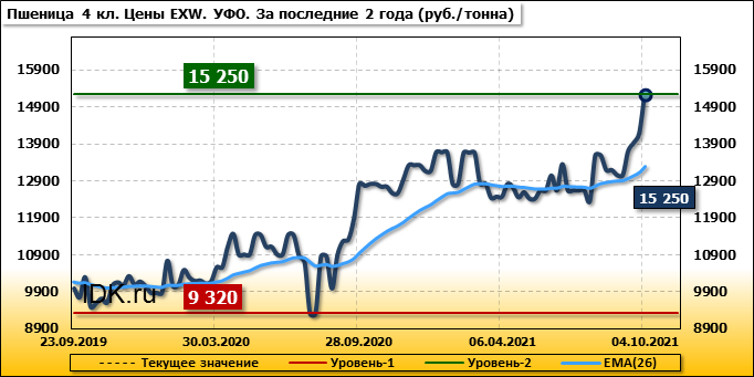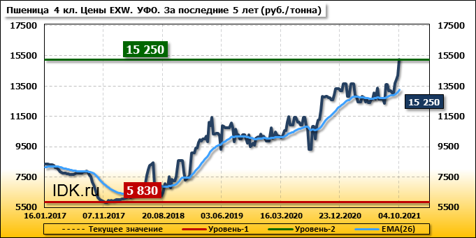 Цены на пшеницу 4-го класса поднялись на 1063 руб./т. и на данный момент составляют 15250 рублей за тонну.