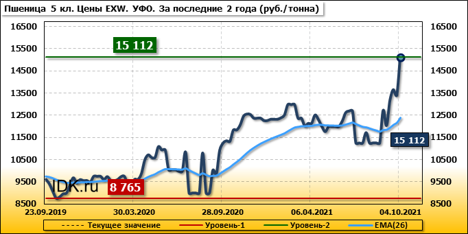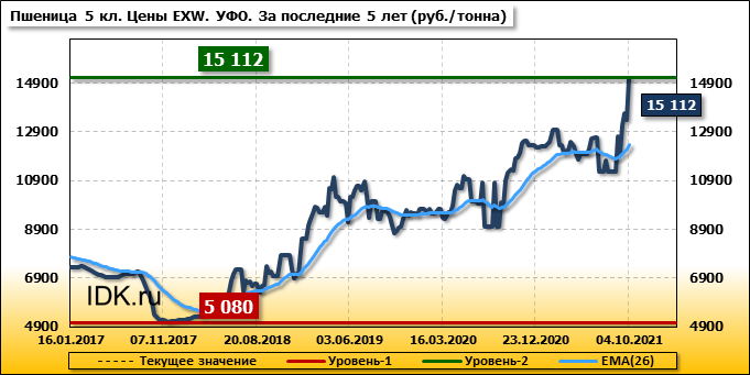 Цены на пшеницу 5-го класса повысились на 1712 руб./т. и на данный момент составляют 15112 рублей за тонну.