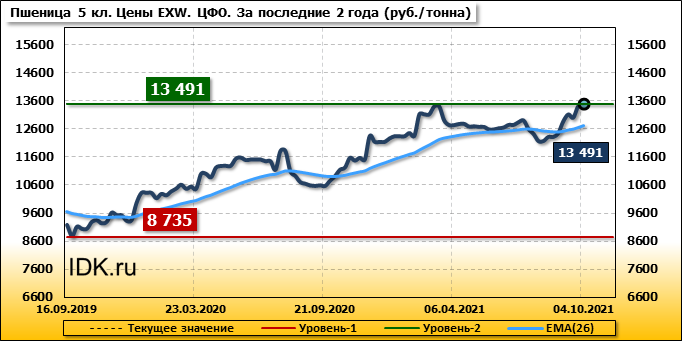 Цены на пшеницу 5-го класса повысились на 81 руб./т. и на данный момент составляют 13491 рубль за тонну.