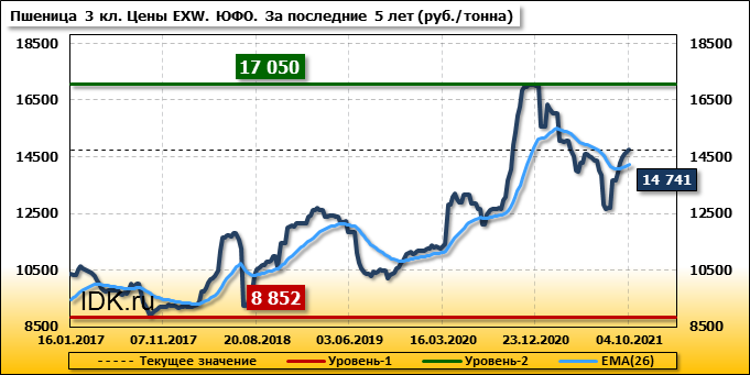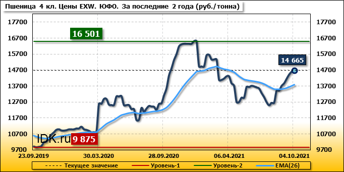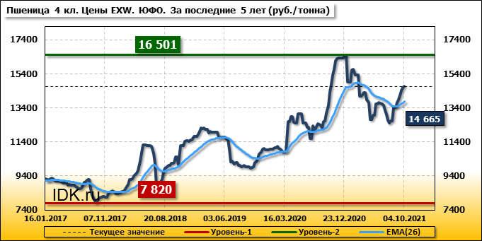 Цены на пшеницу 4-го класса поднялись на 76 руб./т. и на данный момент составляют 14665 рублей за тонну.