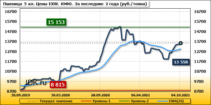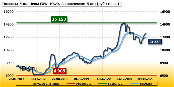 Цены на пшеницу 5-го класса повысились на 127 руб./т. и на данный момент составляют 13558 рублей за тонну.