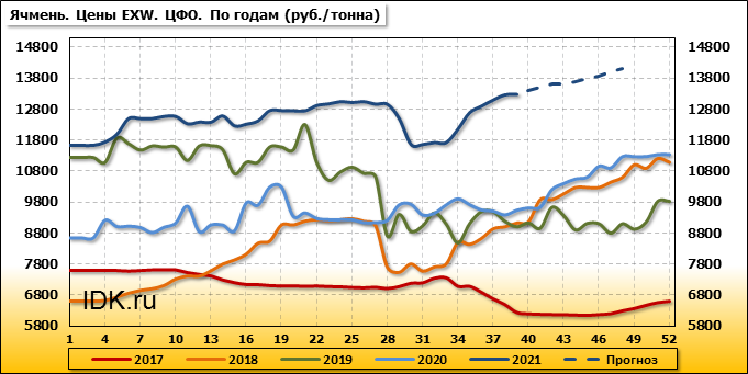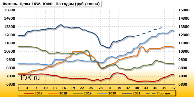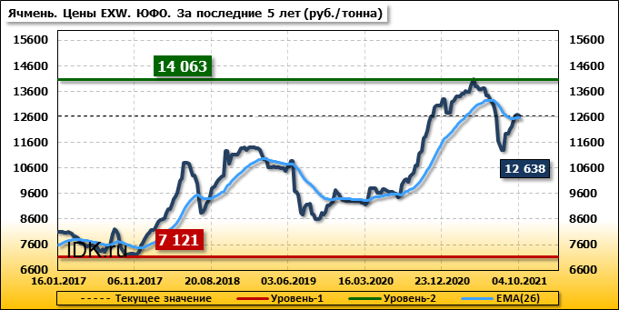 В Южном федеральном округе внутренние цены на ячмень упали на 38 руб./т. и на данный момент составляют 12638 рублей за тонну.
