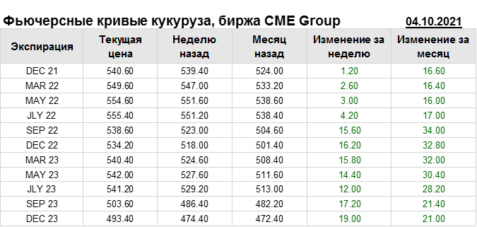 На 04.10.2021 стоимость кукурузы на бирже CME Group по контракту DEC 21 составила 540.6 цента за бушель. За прошедшую неделю стоимость кукурузы на площадке CME Group выросла на 1.2 цента/бушель. Как мы видим на графике, фьючерсная кривая имеет периоды, когда более дальний фьючерс дешевле ближнего. Состояние бэквардации наблюдаем на следующих контрактах: SEP 22; DEC 22; JLY 23; SEP 23; DEC 23. Таким образом, трейдеры предполагают, что возможно превалирование предложения над спросом в указанные периоды.