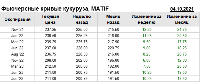 На 04.10.2021 стоимость кукурузы на бирже MATIF по контракту Nov ’21 составила 237.25 евро за тонну. За прошедшую неделю стоимость кукурузы на европейской площадке выросла на 12.25 евро/тонна. Как мы видим на графике, фьючерсная кривая имеет периоды, когда более дальний фьючерс дешевле ближнего. Состояние бэквардации наблюдаем на следующих контрактах: Jan ’22; Mar ’22; Aug ’22; Nov ’22; Jun ’23. Таким образом, трейдеры предполагают, что возможно превалирование предложения над спросом в указанные периоды.