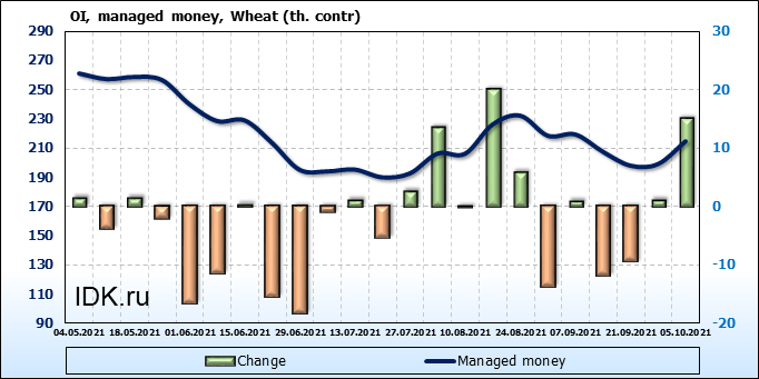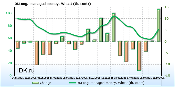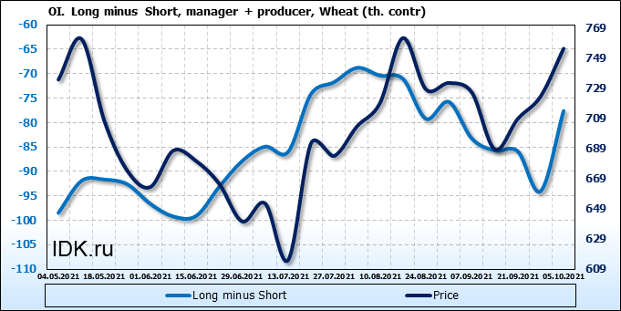 За прошлую неделю, 29.09.21 — 05.10.21, разница между длинными и короткими позициями управляющих увеличилась на 17.5 тыс. контрактов. В тоже время, цена выросла на 31.6 цента.
