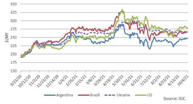 После публикации сентябрьского отчета WASDE цены основных экспортеров повысились. Цены в Аргентине выросли на 17 долларов за тонну до 247 долларов из-за сильного внешнего спроса. Ассоциация грузоотправителей Аргентины (NABSA) сообщила об экспорте 3,8 млн тонн в сентябре по сравнению с 2,8 млн годом ранее. Бразильские цены выросли на 8 долларов за тонну до 266 долларов, несмотря на резкое сокращение экспорта в сентябре по сравнению с прошлым годом. Украинские цены в течение месяца оставались относительно стабильными, поднявшись на 4 доллара за тонну до 269 долларов. Цены в США выросли на 9 долларов за тонну до 276 долларов по сравнению с прошлым месяцем, несмотря на продолжающийся сбор урожая. Данные сентябрьских инспекций и продаж в начале сезона показывают, что международные покупатели становятся более активными, а продавцы повышают ставки.