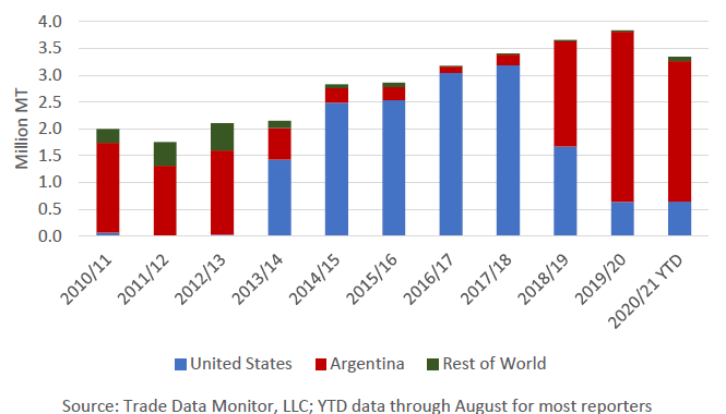 Экспорт кукурузы из США в Перу, похоже, будет примерно таким же, как в прошлом году. В последние годы значительная доля рынка была утеряна в пользу Аргентины, несмотря на торговые преимущества, полученные в результате заключения Соглашения о содействии торговле между США и Перу (PTPA). PTPA вступил в силу в 2009 году и установил беспошлинную квоту (TRQ) на импорт кукурузы из США. TRQ ежегодно росла, и американская кукуруза в рамках квоты была освобождена от переменного сбора, взимаемого Перу, который предназначен для поддержки перуанских производителей, когда цены на импорт ниже, чем на кукурузу внутреннего производства. Другие поставщики по-прежнему облагаются этим переменным сбором. Это преимущество помогло Соединенным Штатам закрепиться на рынке кукурузы в Перу и привело к их доминированию с 2013/14 по первую половину 2018/19 МГ.