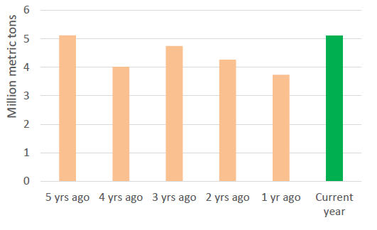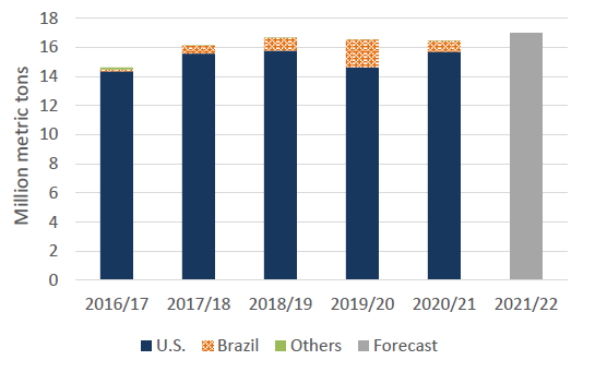 Экспорт из США в Мексику в 2020/21 году оценивается в 15,7 млн тонн, что на 7 процентов больше, чем годом ранее, согласно торговым данным Бюро переписи США и сентябрьскому отчету по инспекциям Министерства сельского хозяйства США. Значительный подъем можно объяснить снижением конкуренции со стороны Бразилии и стабильным спросом на корма. Кукуруза из США, хотя в последние месяцы и дороже, чем бразильская, имеет конкурентное преимущество в логистике. Около 60 процентов экспорта кукурузы из США в Мексику доставляется грузовиками и / или по железной дороге через Техас и, в меньшей степени, Аризону. Доставка из Мексиканского залива США в порт Веракрус занимает всего несколько дней по сравнению с неделей или дольше из Бразилии. Что касается Бразилии, экспортные запасы кукурузы второго урожая в Центрально-Западном регионе в этом сезоне существенно сократились из-за засухи в последние несколько месяцев. До июня / июля следующего года, когда на рынок поступит новый второй урожай, Соединенные Штаты будут, по сути, единственным поставщиком в Мексику.