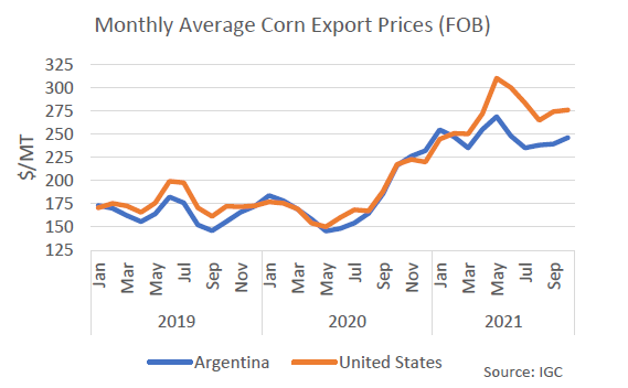 Согласно последнему сообщению Иностранной сельскохозяйственной службы в Лиме, более высокие мировые цены на кукурузу снизили переменную пошлину на импортируемую кукурузу до нуля. В результате кукуруза из США и Аргентины, еще одного крупного поставщика Перу, стала напрямую конкурировать по цене. Несмотря на то, что американская кукуруза поступает в Перу без пошлин и квот с 1 января 2020 года, период, когда цены на кукурузу из Аргентины были конкурентоспособными или более низкими, чем на американскую кукурузу, привел к инверсии рыночных долей; в 2019/20 году рыночная доля Аргентины превысила 80 процентов. Отчеты об экспортных продажах не показали отсроченных продаж кукурузы США с начала апреля 2021 года, что означает, что Аргентина сохранила свою долю рынка и в 2020/21 году. Будущее экспорта кукурузы в Перу будет зависеть не только от соотношения цен на кукурузу в США и Аргентине, но также от внутренних цен на кукурузу и их влияния на переменную пошлину.