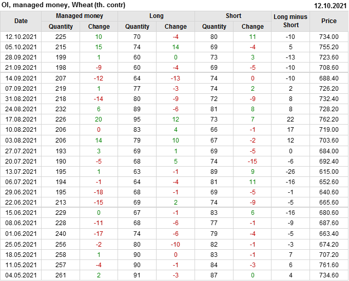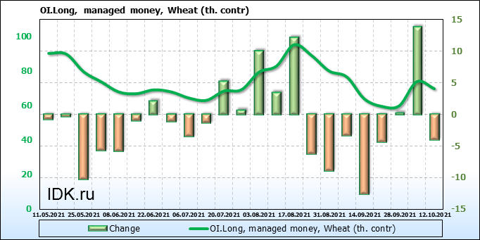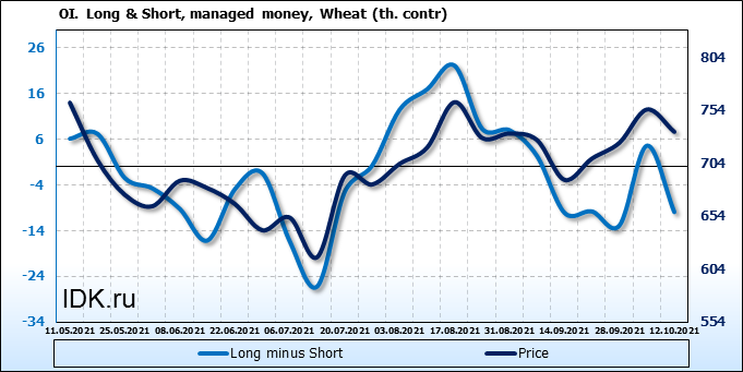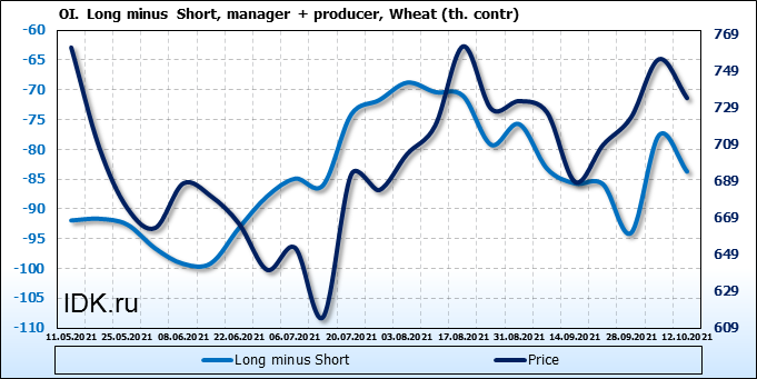 За прошлую неделю, 06.10.21 — 12.10.21, разница между длинными и короткими позициями управляющих увеличилась на 14.6 тыс. контрактов. В тоже время, цена упала на 21.2 цента.